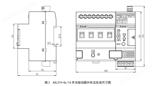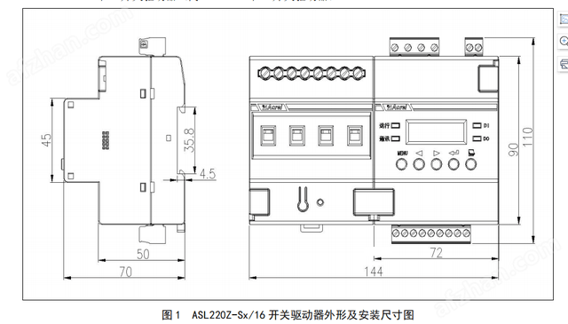 4. 安裝與接線 4.1外形及安裝尺寸(mm) ? ASL220Z-Sx/16開(kāi)關(guān)驅(qū)動(dòng)器(同 ASL220-Sx/16 開(kāi)關(guān)驅(qū)動(dòng)器)
